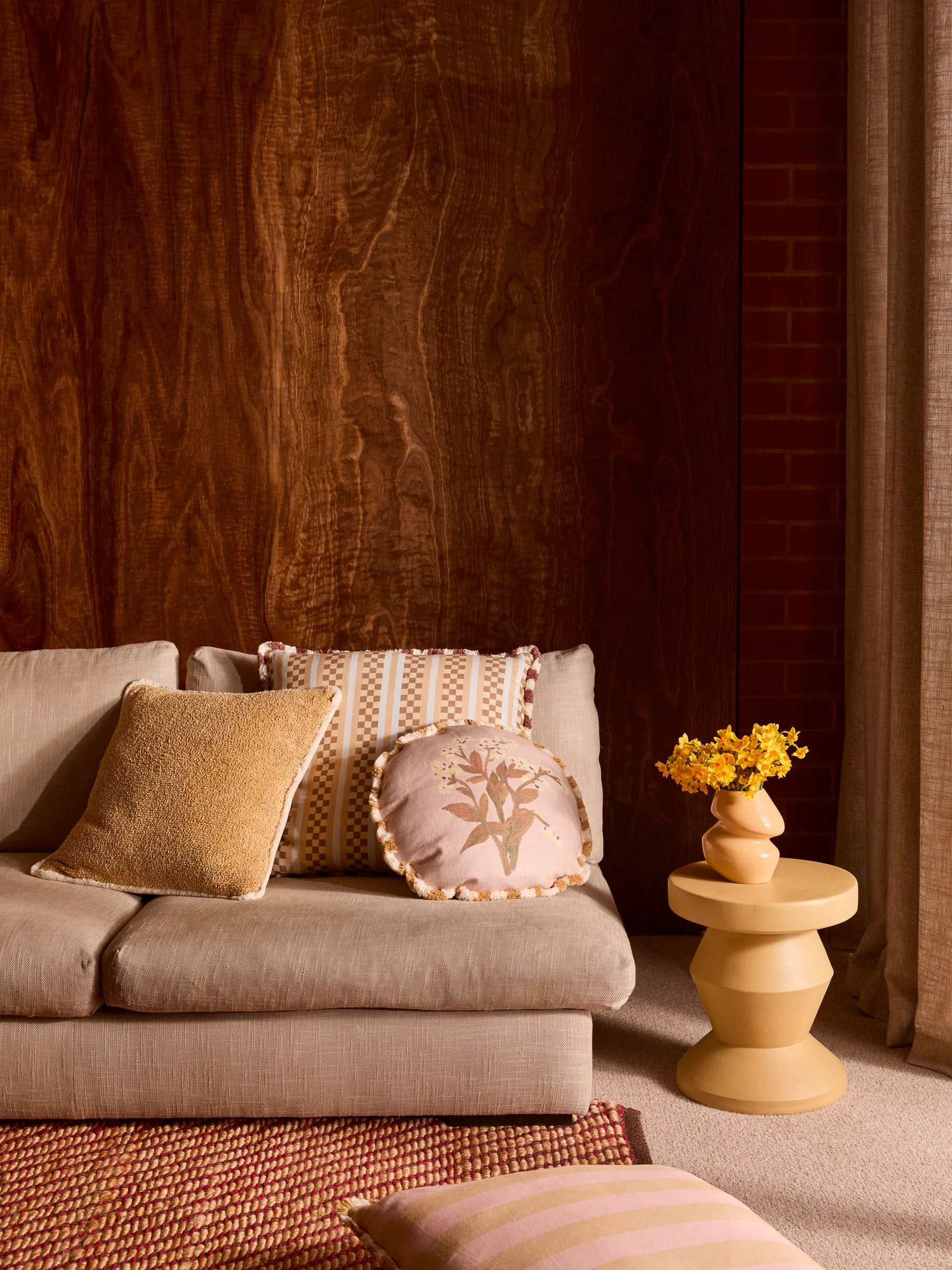 This round linen cushion is dotted with tiny Forget Me Not blooms in caramel, bringing a sentimental floral touch and earthy warmth to your home.