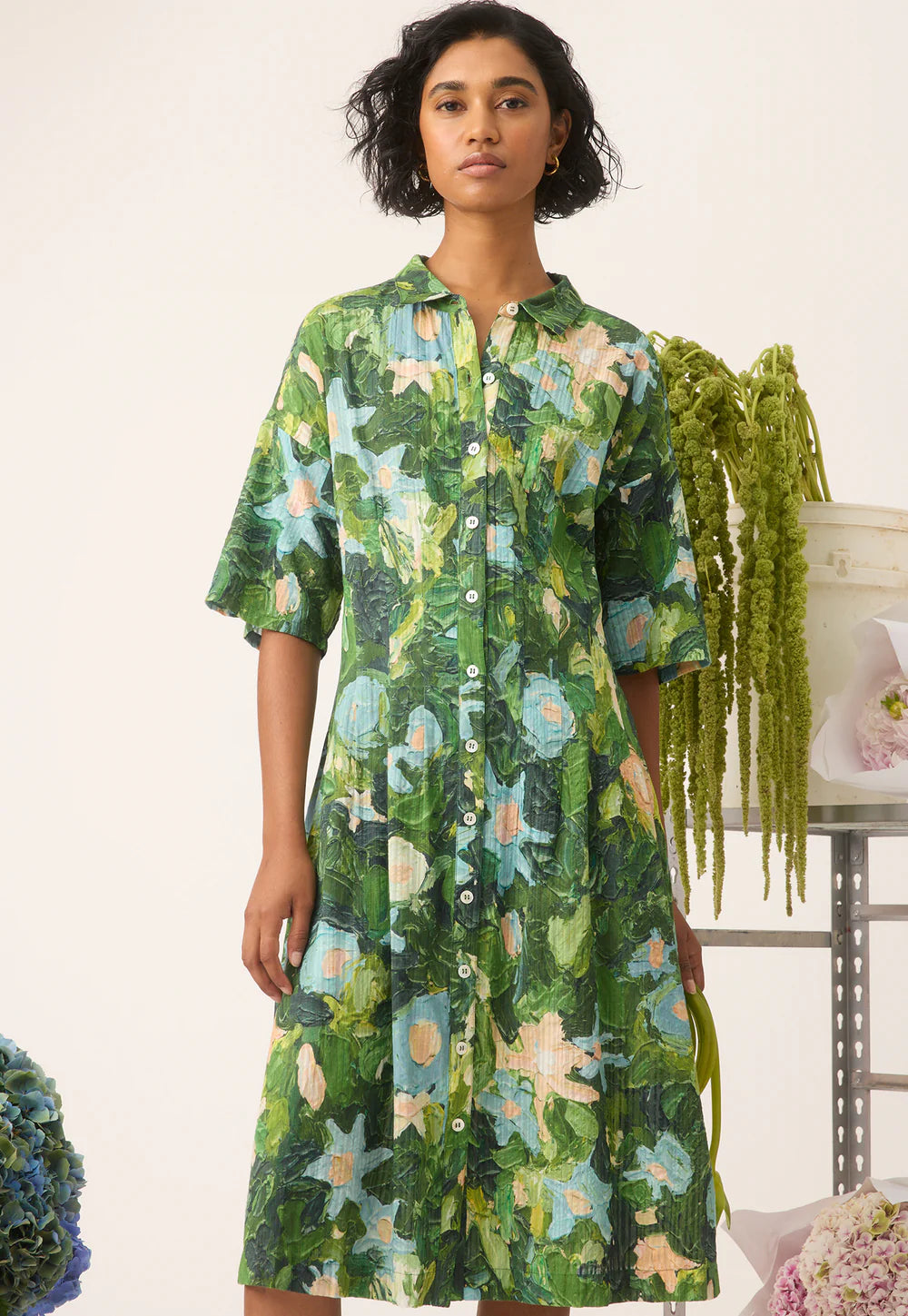 An update on the classic shirtdress with an A-line silhouette and delicate pintucks that define the waist, keeping it loose off the body.